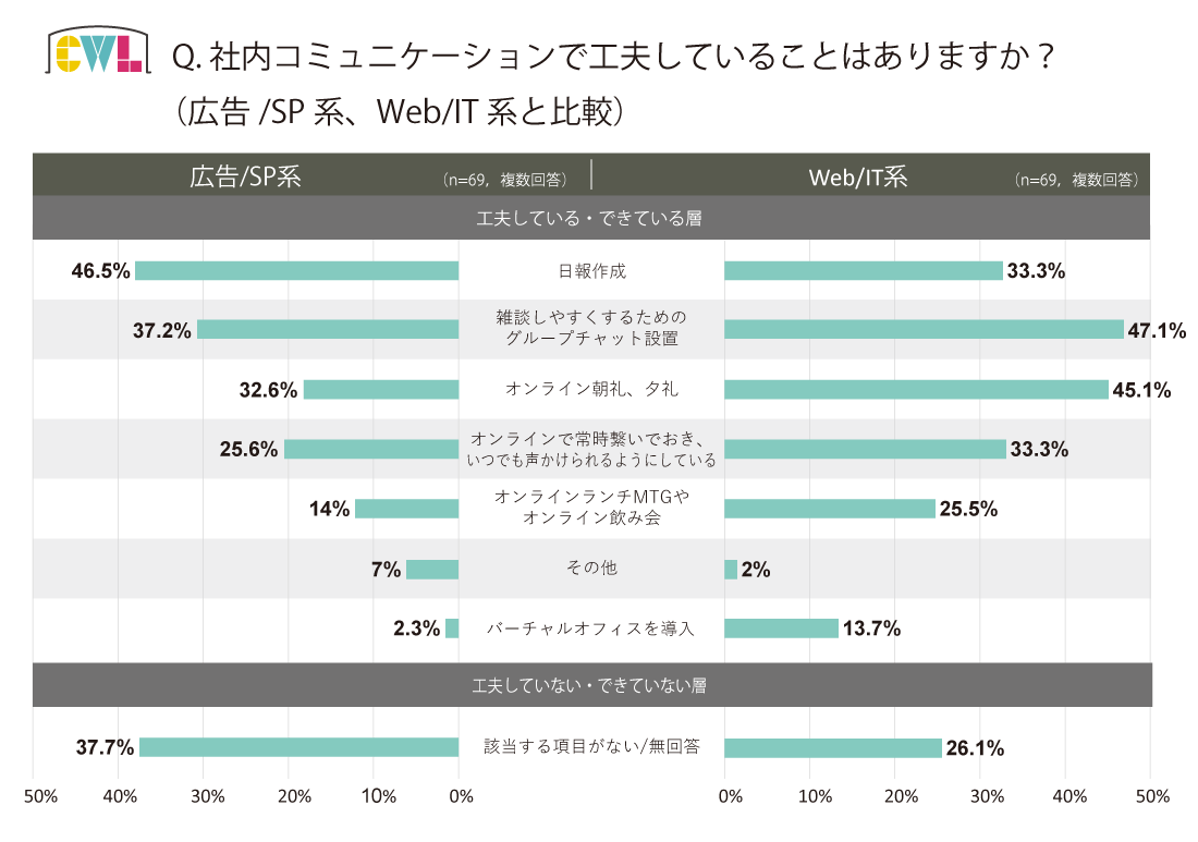 「 グループチャット」の項目が最も多いですが、広告/SP系クリエイターよりも「 オンライン朝礼、夕礼 」や「オンラインランチMTG」「オンライン飲み会」などオンラインツールを駆使して積極的に社内コミュニケーションを取ろうとしていることが分かりました。