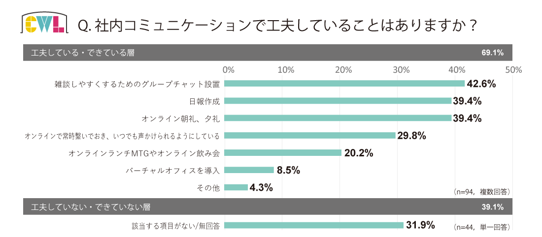 今回のアンケート調査では、社内コミュニケーションの工夫をしている人が69.1%、特に何も工夫していない(できていない)人は31.9%となりました。