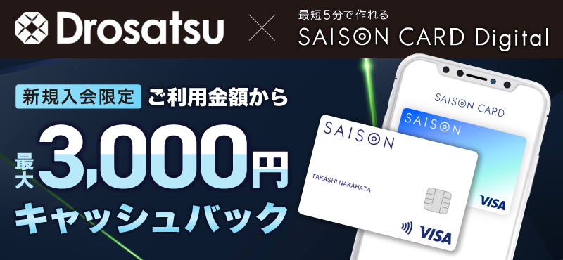 SAISON CARD Digital(セゾンカードデジタル)の新規ご入会・ご利用で、ドローンのレンタルや購入費用から最大3,000円キャッシュバックします。