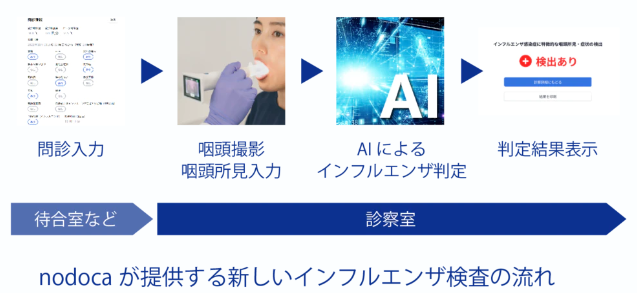 nodocaは、日本で初めて(※1)「新医療機器(※2)」として製造販売承認を取得したAI搭載医療機器です。咽頭(のど)の画像と問診情報をAI解析し、感染症に特徴的な所見等を検出することで、インフルエンザの診断補助に用いることが可能です。2022-2023年シーズンは、国をまたいだ人流が復活していることから、日本感染症学会を始め、医学界からインフルエンザの流行を危惧する意見が発せられており、発熱患者に対応するクリニックの業務負荷増大も懸念されています。nodocaは、痛みが少なく、判定開始から数秒〜数十秒で判定結果を得られる検査のため、クリニックでの発熱患者診療の課題解決に寄与することが期待されます。