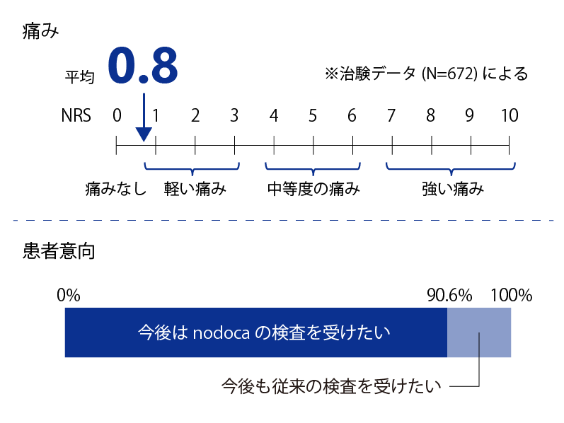 nodocaを用いたインフルエンザ検査は、専用の咽頭カメラを患者さんの口腔内に挿入し、撮影することにより患者さんの負担は最小限で済みます。治験時のNRSによる痛みの評価は平均0.8と低く、患者さんに優しいインフルエンザ検査を提供できます。実際に、治験参加者の90.6%が「今後はnodocaの検査を受けたい」と回答しています。