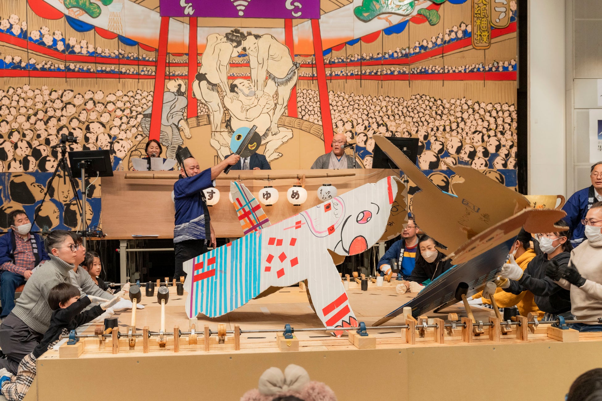 「巡業」と称する力士制作ワークショップでは、墨田区内に4 つの部屋(東向島・東駒形・亀沢・キラキラ橘)を設け、子どもたちを中心としたチームでアイデアを出し合いながら、身長180 ㎝超の巨大ダンボール力士をつくります。それぞれの部屋から8体ずつ、個性豊かな力士が集う「本場所」はトーナメント方式による取組で、十両に始まり勝つほどに番付を上げ、優勝すると横綱の位に輝きます。会場では、制作チームの子どもたちはじめ、みんなで土俵を叩きながら対戦を進めますが、「電子どんどこ!」というWEBアプリからも好きな力士を応援できます。取組の様子はYouTubeライブで配信、スマホの画面をタップすると土俵の周りにあるハンマーが動く仕組みで、遠方からもたたき手として参加いただけます。