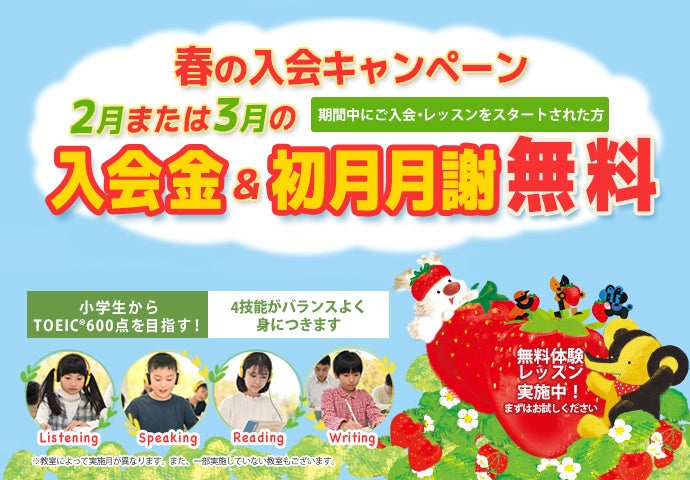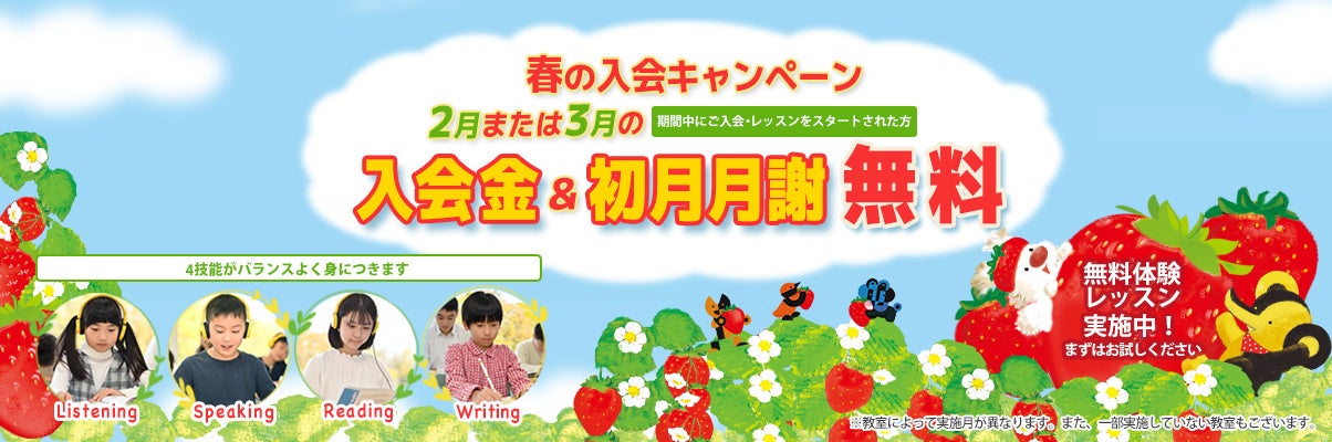 ・月謝の無料特典は、2月または3月のレッスンのみ対象です。2月または3月の途中や後半に入会された場合も、2 月または3月の月謝の無料特典を翌3月、または翌4月以降に繰り越すことはできません。