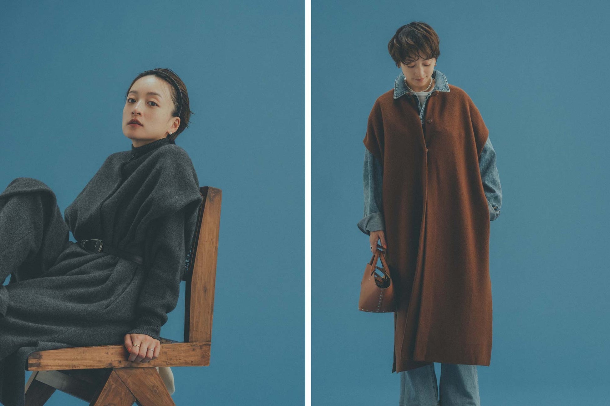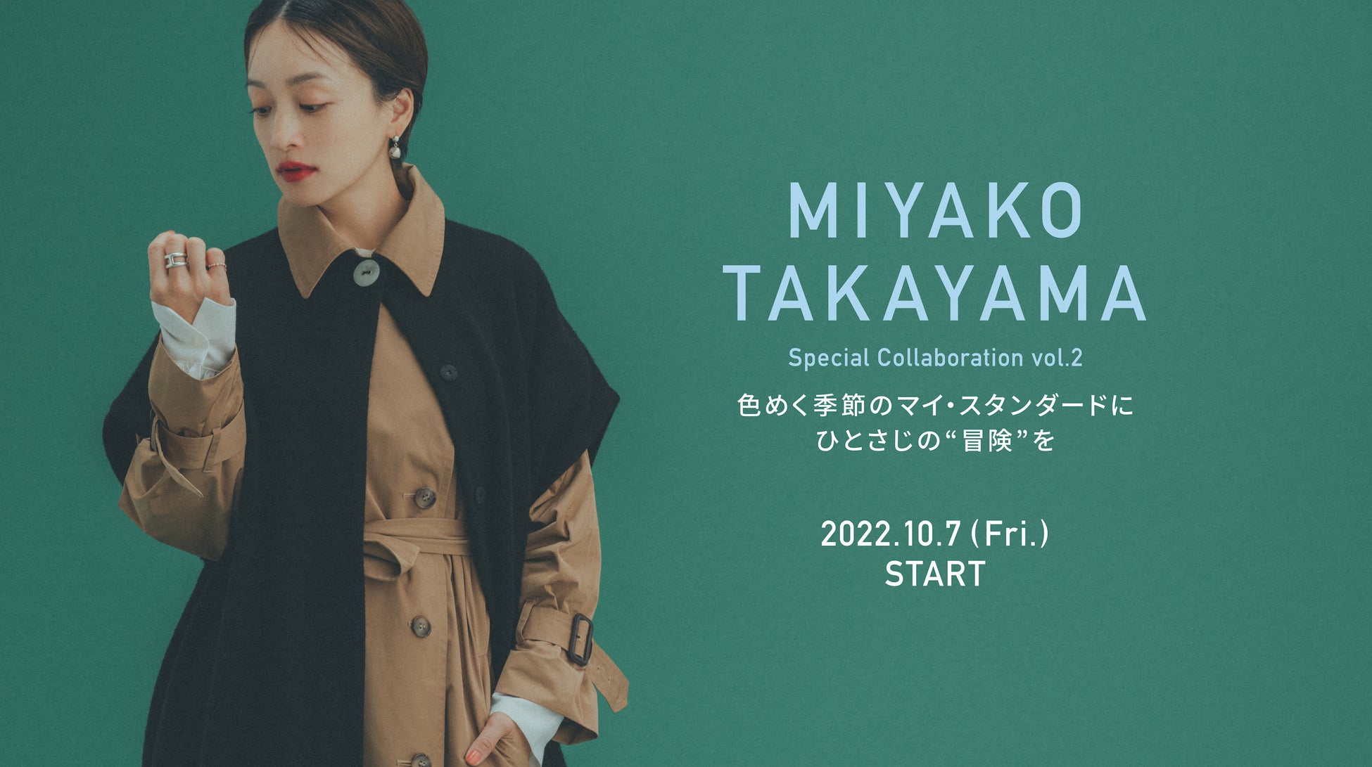 MIYAKO TAKAYAMA Special Collaboration vol.2 の今回は、「色めく季節のマイ・スタンダードにひとさじの“冒険”を」をテーマに、高山都さんの愛する秋冬の定番アイテムに、1ミリ単位の“こだわり”と“冒険”を詰め込んで生まれたドレストレンチ、BIGボタン付きニットジレ、美しいラインのニットパンツ(3型)を展開いたします。季節が深まるごとに、色や素材を重ね、レイヤードスタイルが楽しめるアイテムに仕上がりました。