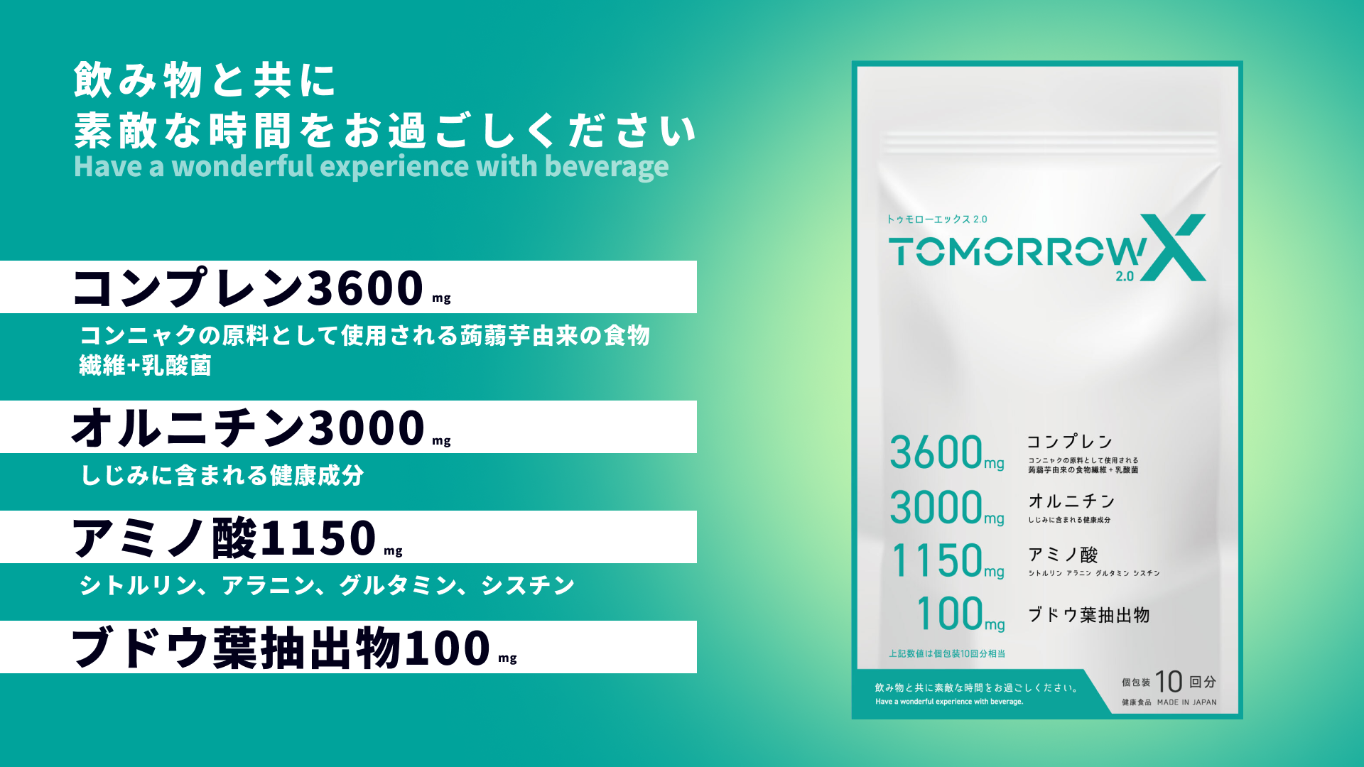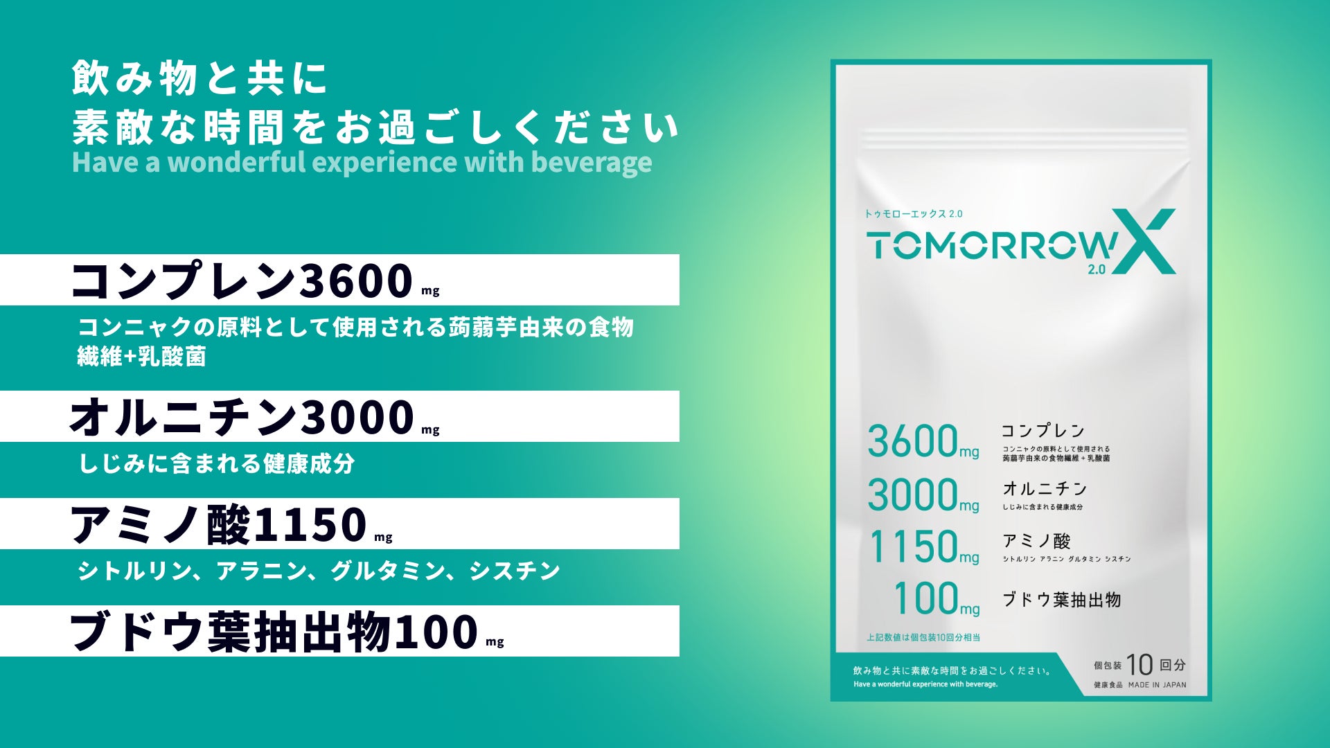 今回発売するトゥモローエックス2.0は、コンニャクの原料として使用される蒟蒻芋由来の食物繊維+乳酸菌「コンプレン」を高配合し、オルニチンを始めとして複数のアミノ酸やブドウ葉抽出物を配合した「ドリンクシーン応援サプリメント」です。