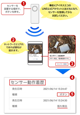 発信機を罠と一緒に設置し、罠の作動を発信機が検知すると、インターネットのネットワークを通じて、スマートフォンやパソコンに通知(メール・LINE等)が届く仕組みになっています。