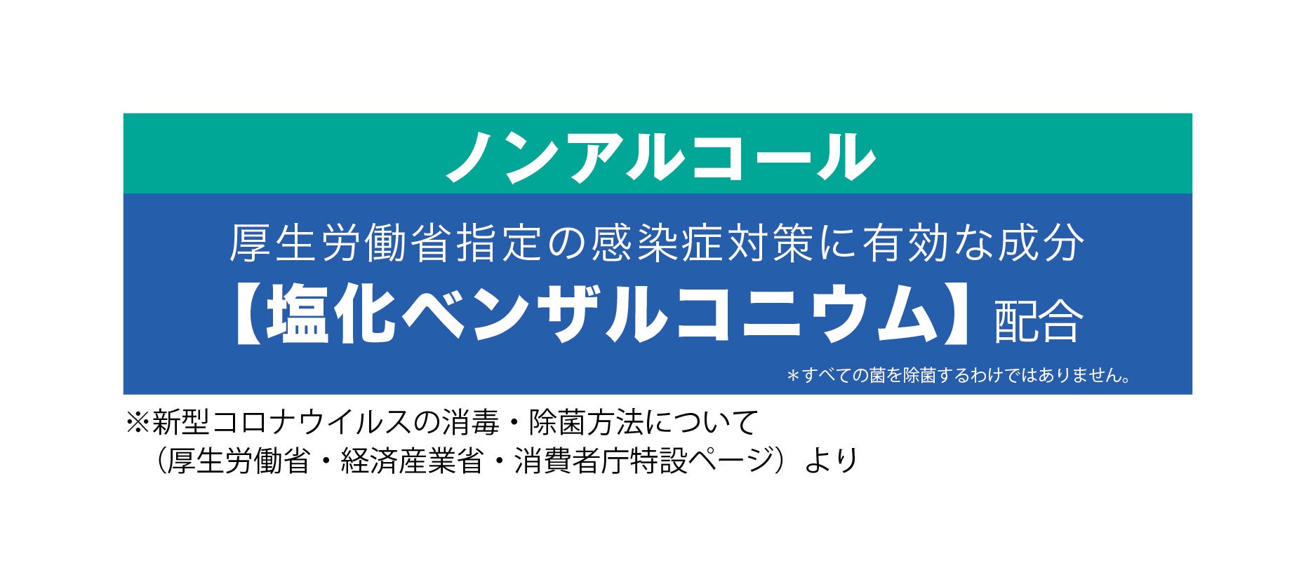 また、厚生労働省指定(※)の新型コロナウイルスに有効な成分「塩化ベンザルコニウム」配合でしっかり除菌できます。
