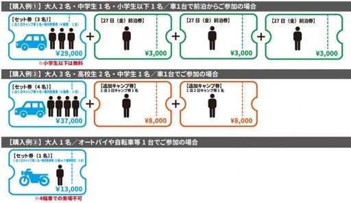 | ■14PEAKS HIMALAYA CAMP & DAY チケット情報 《チケット販売》 Peatix URL: https://14camp-ticket.peatix.com 《発売日》 2022年3月24日(木)12:00より 《料金(⼩学⽣以下の⼊場は保護者同伴に限り無料)》 【セット券(1名)】1泊2日キャンプ券 1名(公共交通機関、もしくは2輪 or 3輪車での来場):13,000円 【セット券(2名)】1泊2日キャンプ券 2名+場内駐車券(4輪車/1台):21,000円 【セット券(3名)】1泊2日キャンプ券 3名+場内駐車券(4輪車/1台):29,000円 【セット券(4名)】1泊2日キャンプ券 4名+場内駐車券(4輪車/1台):37,000円 【追加キャンプ券】 1名:8,000円 ※セット券購入者のみ追加購入可能 【27日(金)前泊券】1名:3,000円 ※セット券購入者のみ追加購入可能 【28日(土)日帰り入場券】1名:4,000円 【29日(日)日帰り入場券】1名:4,000円 ・場内駐車券の単体販売はございません、【セット券】でのみの販売となります。 ・車1台につき2名様以上乗車でのご来場を基本とします。1名様の場合は、【セット券(1名)】で公共交通機関や自転車、オートバイ等でのご来場、もしくは複数名用の【セット券】をご購入のうえ、お車乗り合わせてのご来場をご検討ください。 ・【追加キャンプ券】は、セット券ご購入の方で同一車輌に追加同乗される参加者様分が必要な際にご購入いただいけます。 ・【27日(金)前泊券】は、セット券をご購入様のみ、追加購入いただけます。(前泊券をお持ちの方は、27日(金)15時よりご入場、キャンプ泊が可能です。) ・小学生以下は無料です(ただし、要保護者同伴)。 ・18歳未満の方(または高校生以下)のみでのご利用はできません。 ・大型キャンピングカー(長さ6m×幅2. 5m以上)および牽引車の方は、チケットお申込み前に主催者宛にお問い合わせください。 |