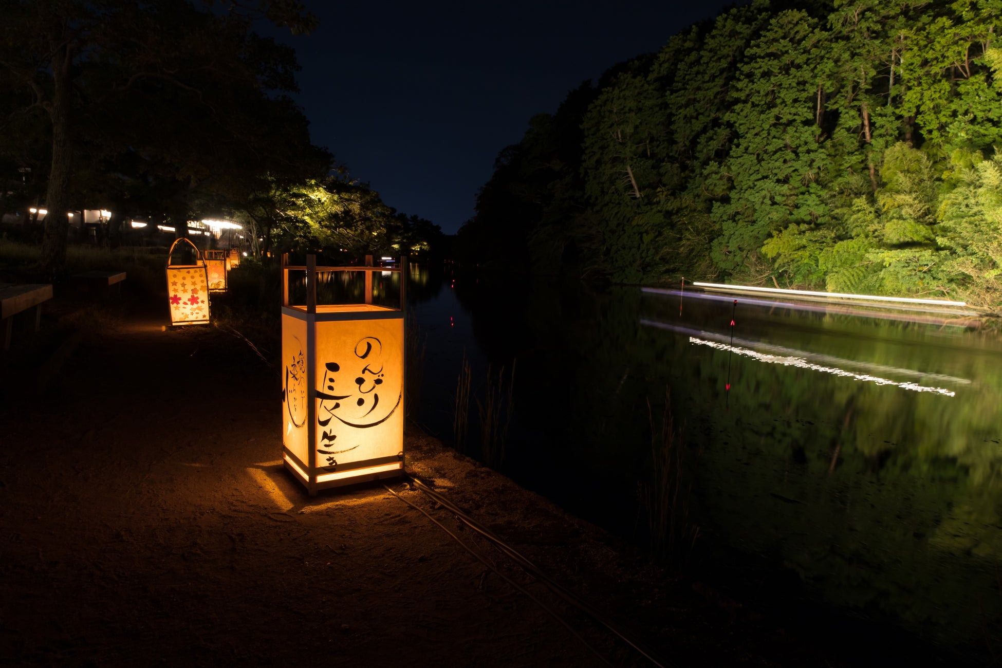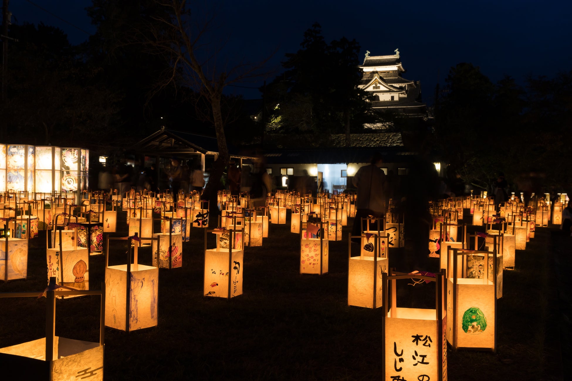 松江水燈路は、松江ライトアップ・キャラバン実行委員会(事務局:一般社団法人 松江観光協会内)が主催する、松江城周辺をライトアップする光のイベントで、城下町松江ならではの光と影が織りなす幻想的な風景を楽しむことができます。水燈路の目玉は、一年でこの時だけの「堀川遊覧船夜間運航」です。船上より風情ある街並みが残る塩見縄手に目をやると、水燈路行燈が揺らぎ、また会場全体でたくさんの行燈が並びます。
