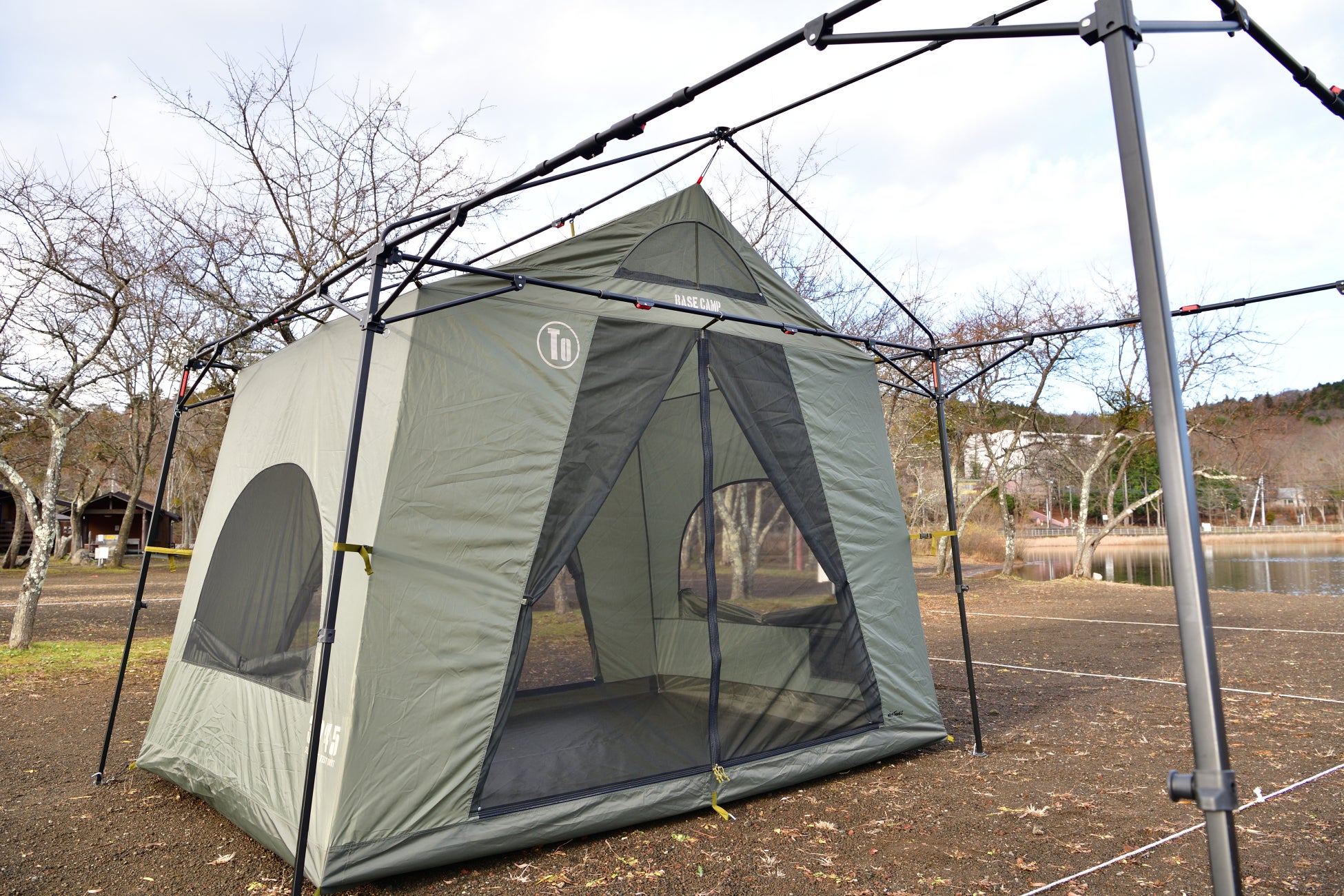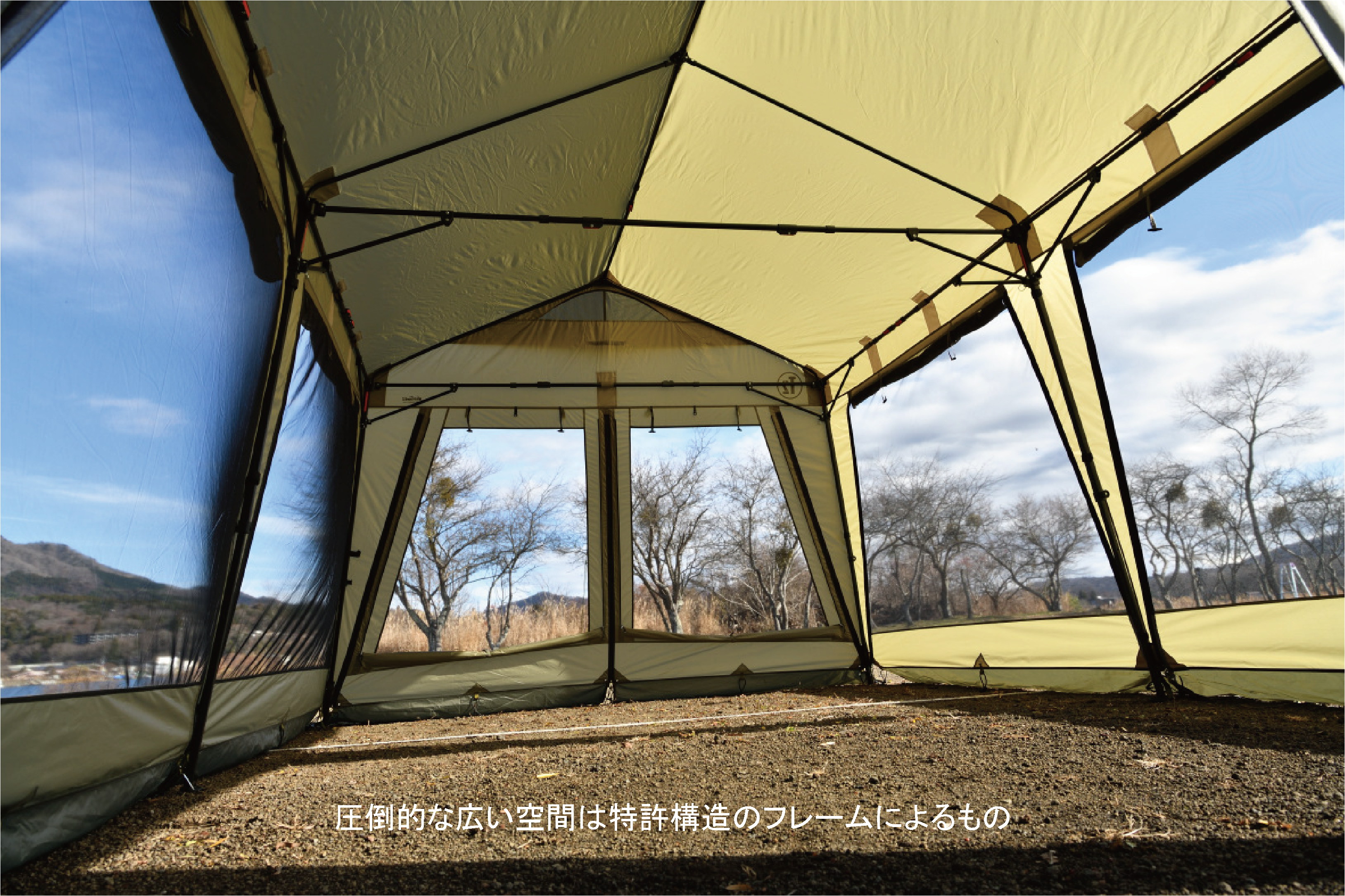 特許構造のフレームは、トラス構造によって強度を高め、最小限の骨組みで最大限の空間を作るベースキャンプで使えるテントとして開発し、今も進化を続けるレクタングル型シェルターテントとなっています。