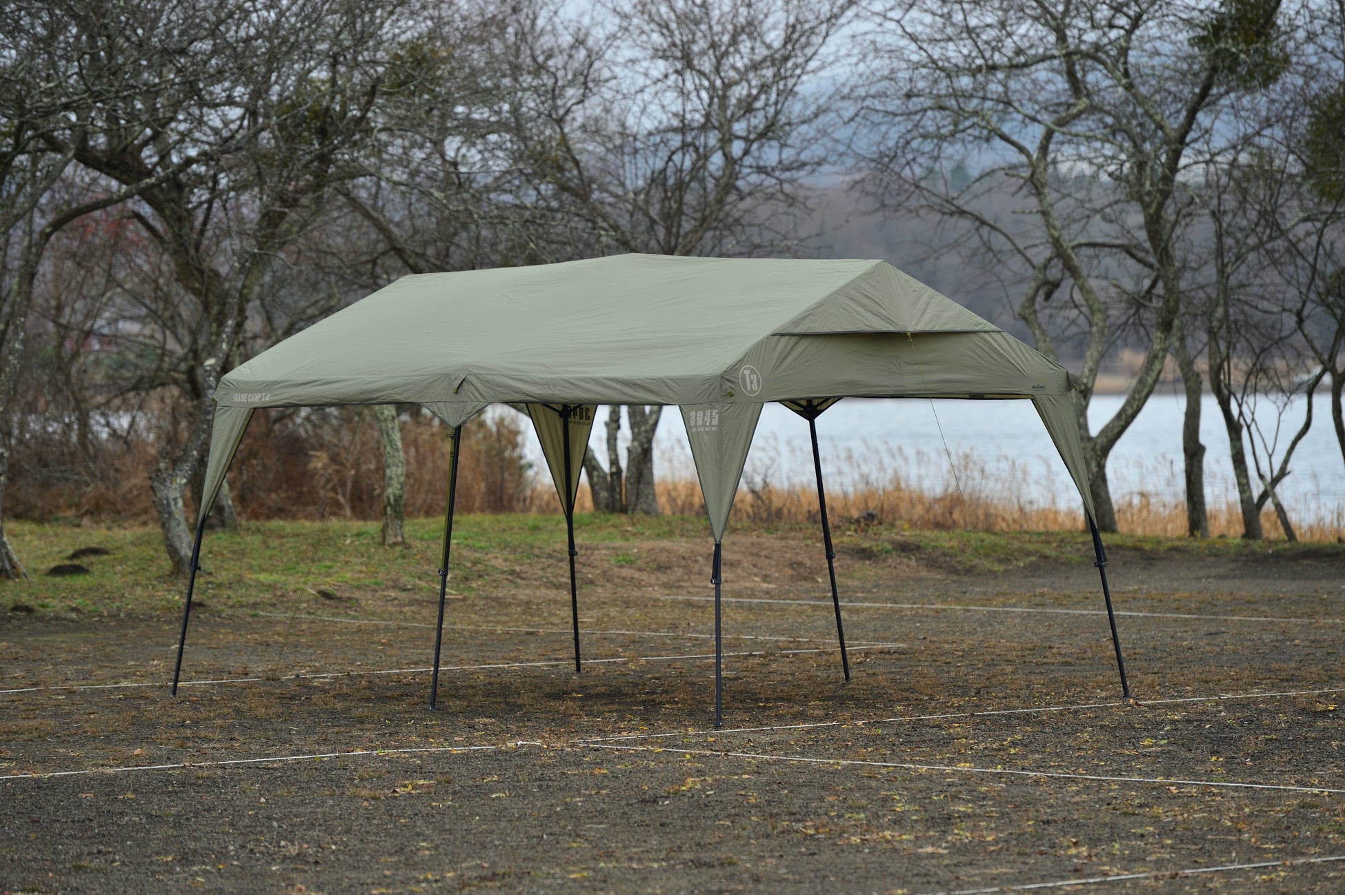 ベースキャンプとして機能する長方形のタープ。