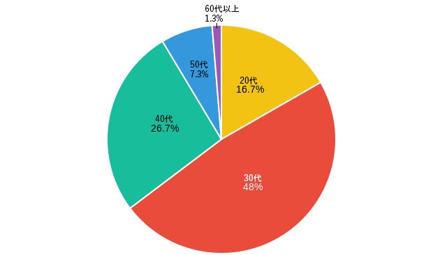 今回のご回答者は全員が既婚女性となっており、年代は「20代 16.7%(50人)」「30代 48.0%(144人)」「40代 26.7%(80人)」「50代 7.3%(22人)」「60代以上 1.3%(4人)」となっております。