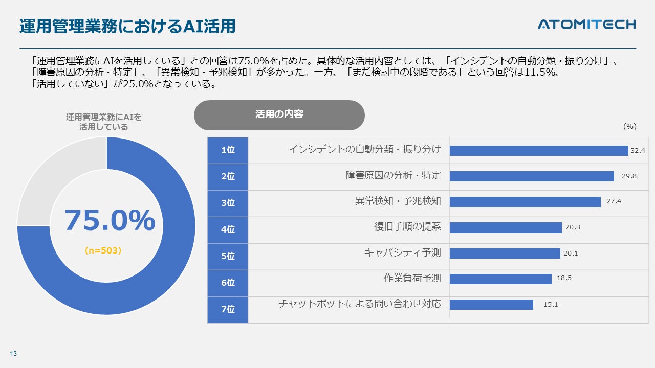注目すべきは、75.0%がすでにAIを運用業務に活用しているという結果です。AIの活用内容としては、「インシデントの自動分類・振り分け」「障害原因の分析・特定」「異常検知・予兆検知」などが挙げられました。さらに、87.3%がAIの導入による効果に期待しており、特に「人的ミスの削減」(58.8%)や「対応時間の短縮」(52.1%)といった業務効率化への貢献が期待されています。