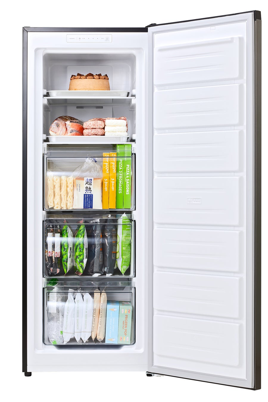 棚板には冷凍のホールケーキや塊肉、カニや魚を丸ごと収納でき、引き出しは前面が透明で中身が確認しやすく、奥や下の方に入ったものをスムーズに整理できます。