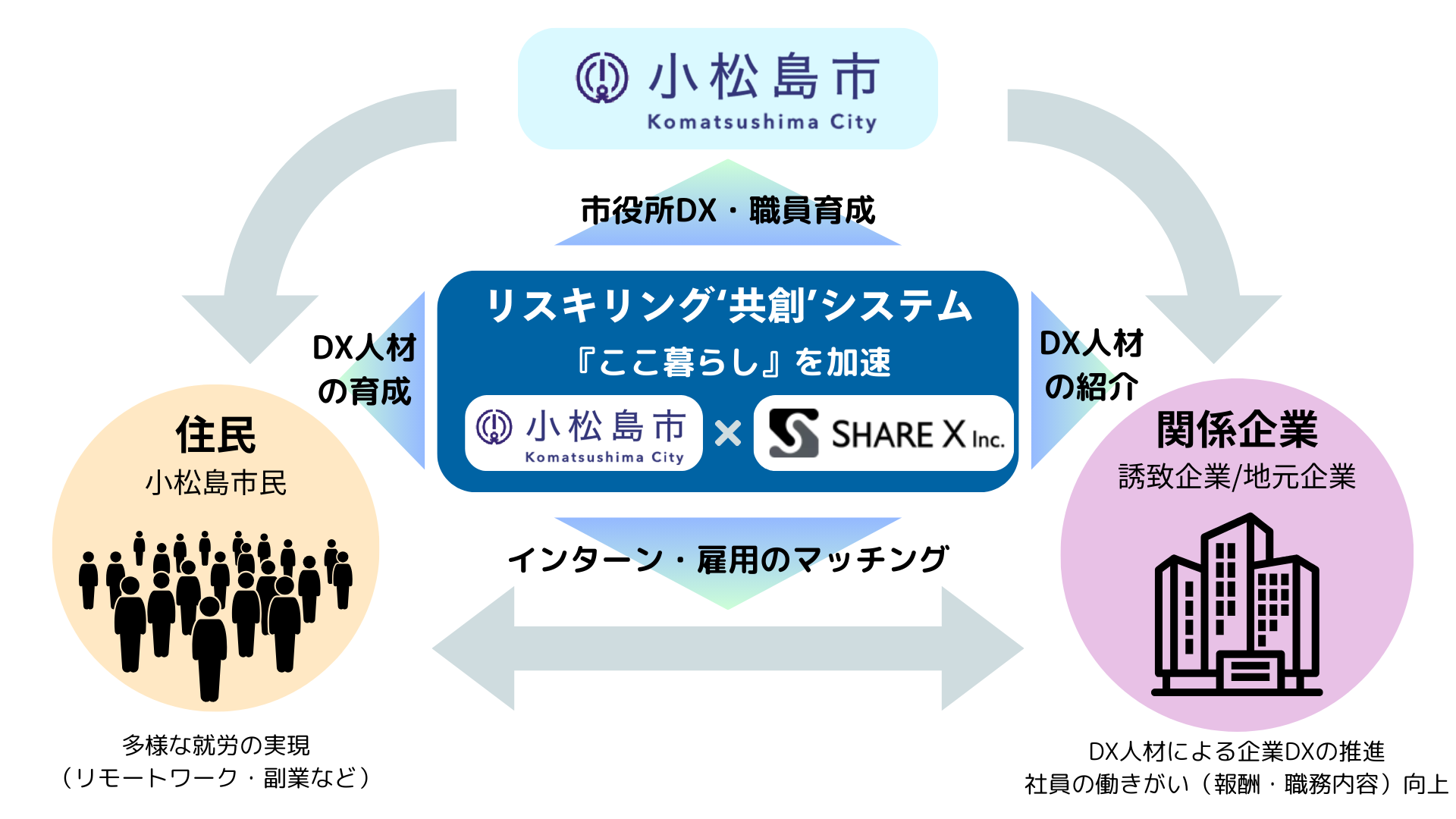 リスキリング共創システムとは、小松島市が掲げる「ここ暮らし」を加速させるための官民が共創するスキームのこと。当社は、小松島市内だけにとどまらず、都心部の県外企業にも「共に成長できる関係企業」として連携してもらうことで「生涯稼ぎ続けることができる地域」をつくり、「暮らしやすいまち」「子育てがしやすいまち」を共に構築してまいります。「やりがいのある仕事」の創出とマッチングにつなげることで、市民の皆様が、ここ(小松島市)で働きがいある仕事ができる「ここしごと」の創出を行ってまいります。