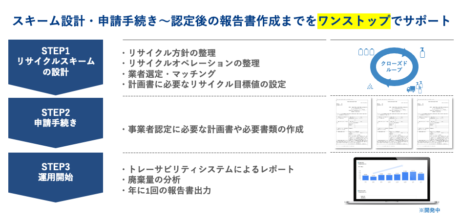 4月1日より施行される「プラ新法」制度認定手続きに必要なリサイクルスキームの設計や申請書類・運用書類の作成をワンストップで支援