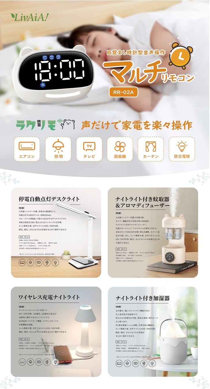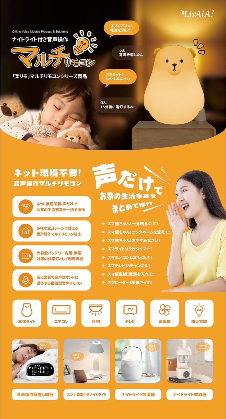 家のさまざまな家電を声で操作できるオフラインの「楽リモ」マルチリモコンシリーズ。クマ型の可愛いナイトライトがリモコンがわりになる製品や、目覚まし時計型のマルチリモコンなどを展示しています。
