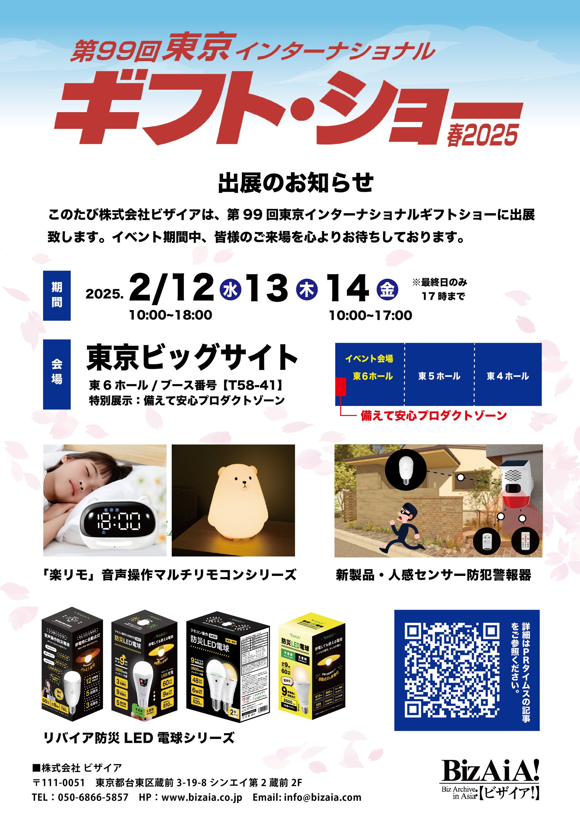 株式会社ビザイア(本社:東京都台東区、代表取締役:趙舒林)は、2025年2月12日(水)から14日(木)まで、東京ビッグサイトで開催される「第99回東京インターナショナル・ギフト・ショー春2025」の特別展示企画「備えプロダクトShowcase」に、ブース【コマ番号:東6ホールT58-41】を出展いたします。
