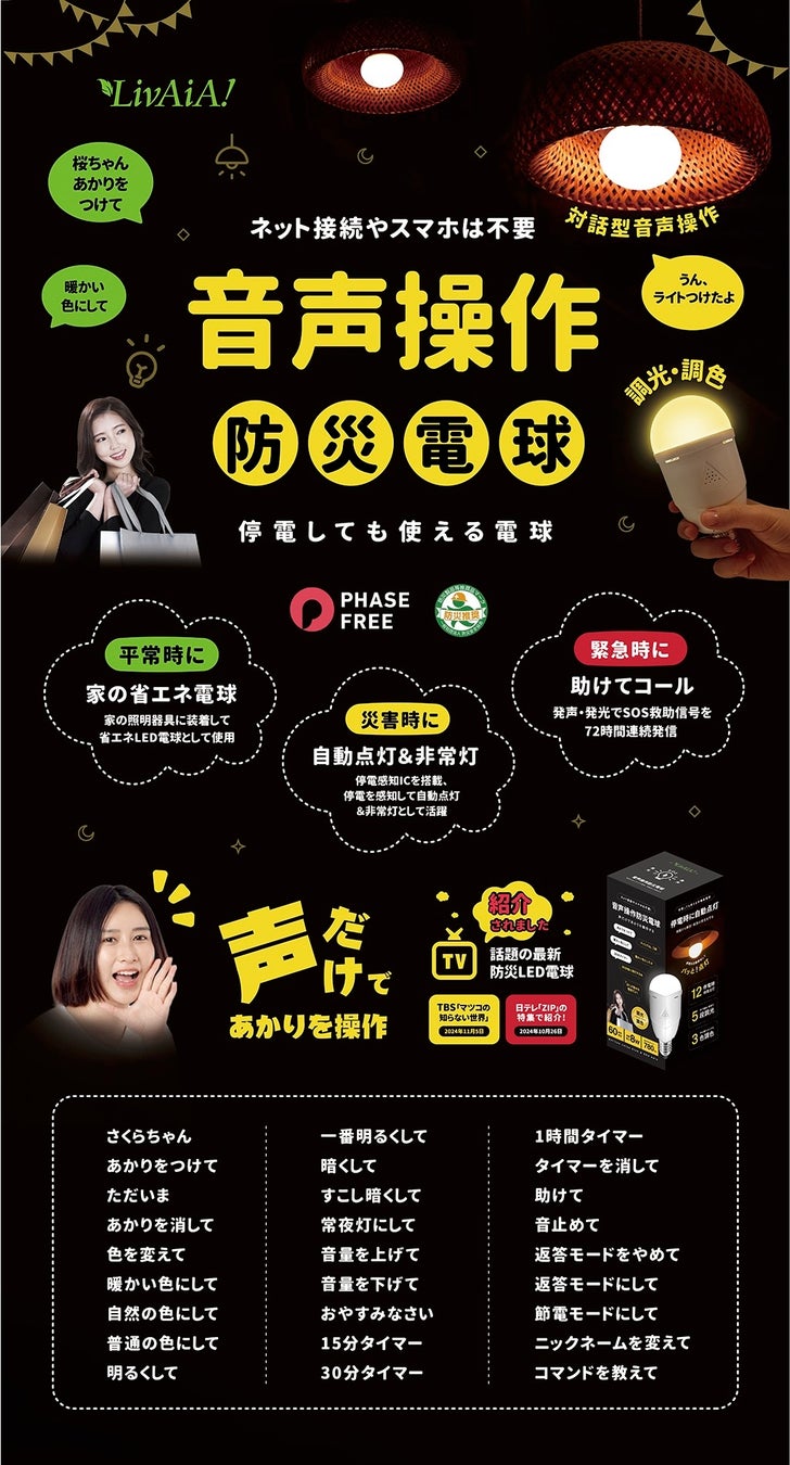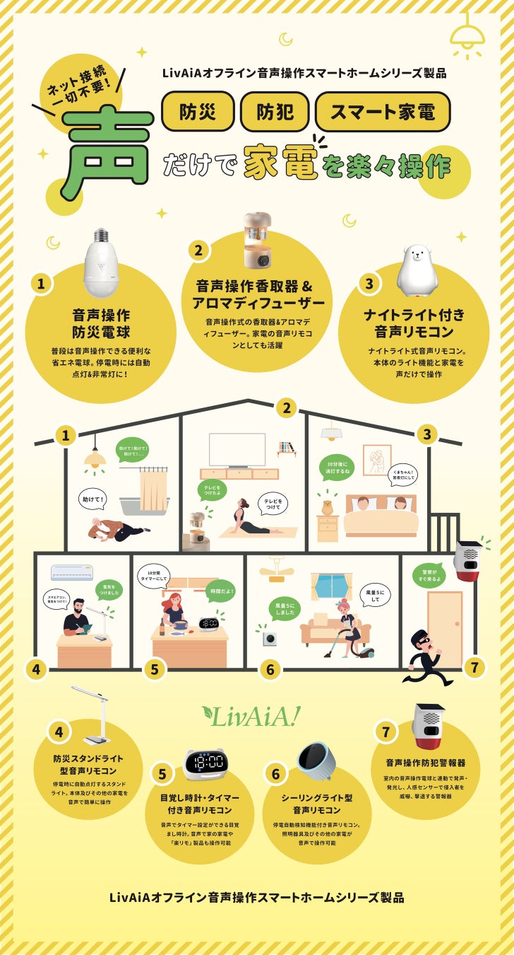 会場では昨年TVで話題の音声操作・リモコン操作防災電球シリーズ製品以外に、生活家電ブランド「LivAiA!(リバイア)」の音声操作防犯警報器や、オフラインで声だけで家の生活家電をまとめて操作できる業界最強のオフライン音声認知技術を活かしたグッズを展示しています。