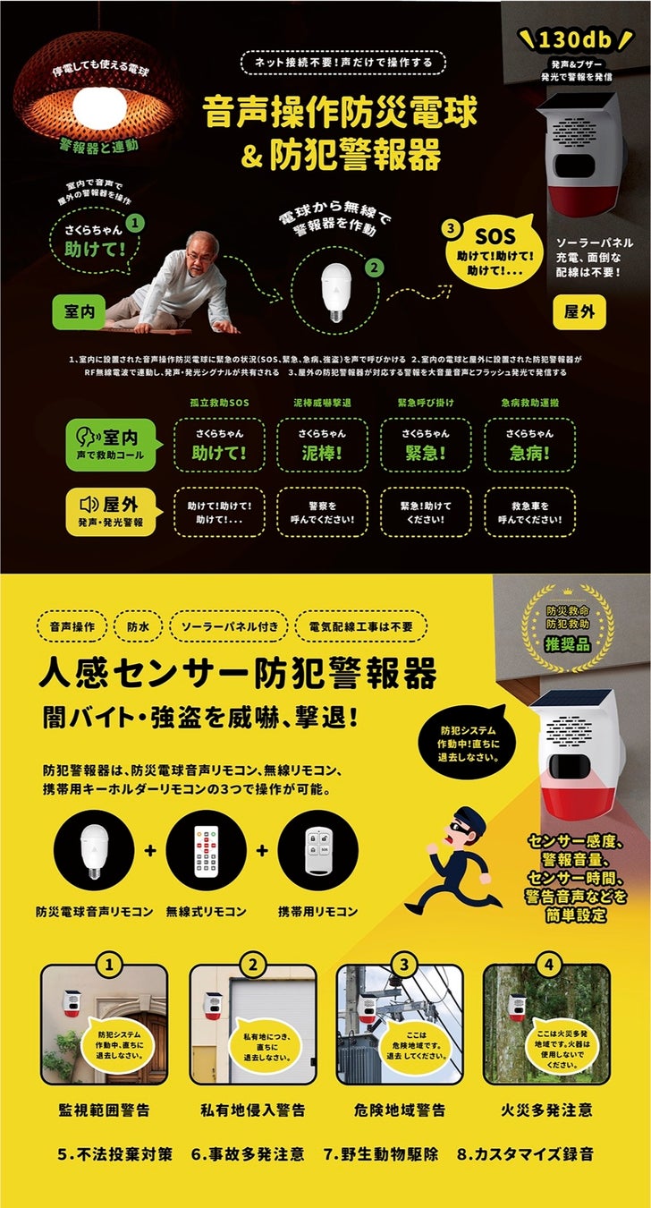 ブザー音などで警告をする従来の警報器とは異なり、不審者威嚇、近隣への救援要請など、多彩な音声メッセージで警報を発信します。人感センサーによって自動で警報を発信するほか、無線機能により、室内にいながら音声による操作で室外の警報器が作動します。