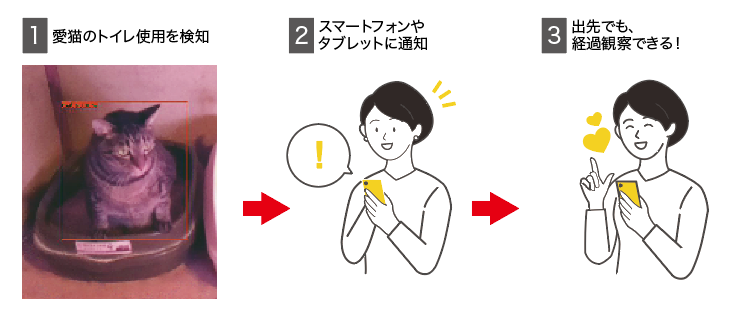 猫は腎不全、膀胱炎、尿石症、膀胱結石など泌尿器疾患にかかりやすく尿ケアが大事です。愛猫と離れている留守中も、出先からスマホやタブレットに写真とメッセージで通知され、愛猫のトイレ利用を見守ることができるソリューションです。