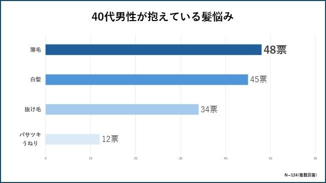 「薄毛」が48票を獲得し、最も多くの40代男性が抱えている「髪」の悩みであることが分かりました。続いて、「白髪」が45票と僅差で2位となり、髪のボリュームや色に関する悩みがこの年代で特に強いことが明らかになりました。また、「抜け毛」が34票で3位にランクインし、髪の健康に対する懸念が続いていることが確認されました。一方で、「パサツキ・うねり」に関する悩みは12票と、他の項目に比べて少ない結果となりましたが、それでも一部の男性が髪質の変化に対して懸念を抱いていることがわかります。
