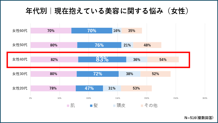 ●「髪」や「肌」の悩みを抱える年代として40代が増える原因を考察