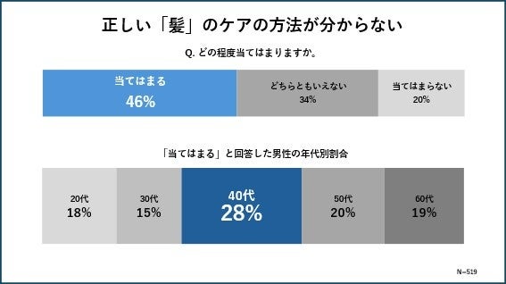 さらに、「正しい髪のケア方法が分からない」という男性は、全体の46%と半数近くを占めています。特に40代男性の約3割が「正しい髪のケアの方法が分からない」と回答し、他の世代に比べて最も高い割合を示し、多くの男性が髪のケアに不安を感じていることが浮き彫りになっています。
