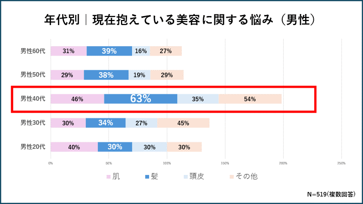 【年代別 美容に関する悩みを調査】40代男女が最も美容に関する悩みを抱えていることが判明 約29%増加!40代で男性の髪悩みが急激に増えヘアケア迷子に