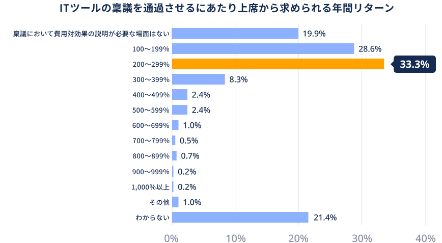 IT製品の稟議を挙げ通過させるにあたって上席から求められる年間リターンについては、「200−299%」が33.3%とトップとなりました。