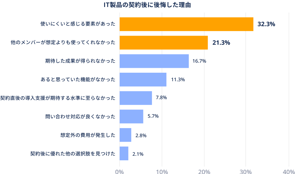 IT製品の導入後に後悔した理由としては「使いにくいと感じる要素があった」が32.3%、次いで「社内メンバーが想定より使ってくれなかった」が21.3%と、社内での活用定着に関する課題を感じている方が多いことがわかりました。