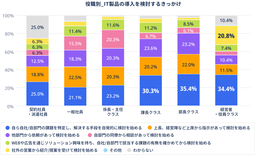 IT製品の導入を検討するきっかけとして一番多いものについて訊ねたところ、課長クラス以上では「自ら自社/自部門の課題を特定し、解決する手段を自発的に検討を始める」割合が3割を超えています。経営層・役員クラスになると社外の営業から紹介/提案を受けて検討を始める」が2割を超えていました。