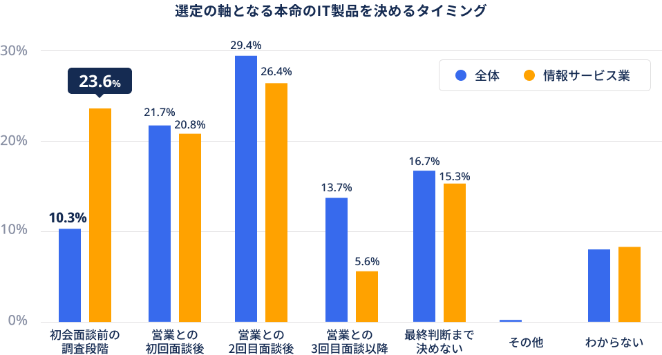 「本命」として検討するIT製品を決めるタイミングについて、全体では「営業との2回目の面談後」が29.4%とトップでした。しかし情報サービス業においては「営業と初めて面談する前の調査段階」で本命を決めているケースが多く、全体の2.3倍の23.6%でした。