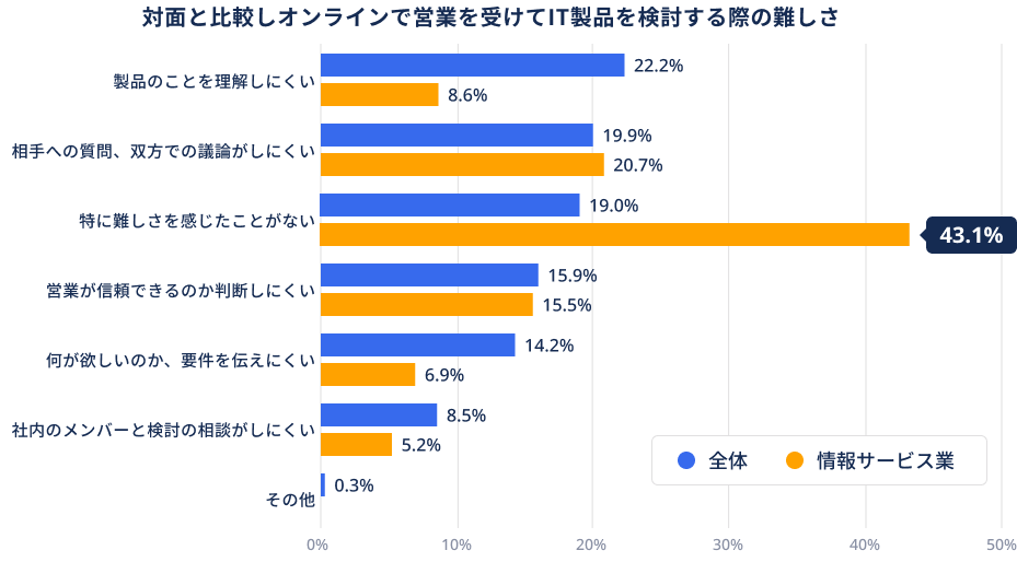 また、対面と比較しオンラインで営業を受けてIT製品を検討する際の難しさについて訊ねたところ、全体では「製品のことを理解しにくい(22.2%)」がトップとなりました。一方で、情報サービス業においては43.1%の方が「特に難しさを感じたことがない」と回答しています。