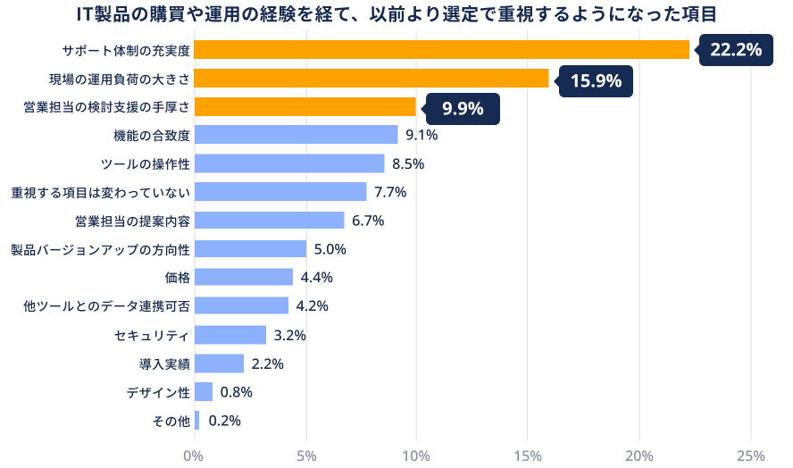 これまでのIT製品の購買や運用の経験を経て以前よりツール選定で重視するようになった項目を訊ねたところ「サポート体制の充実度(22.2%)」がトップとなった。次いで「現場の運用負荷の大きさ(15.9%)」となっており、導入後の運用負荷を軽減するための項目を重要視するようになることがわかりました。