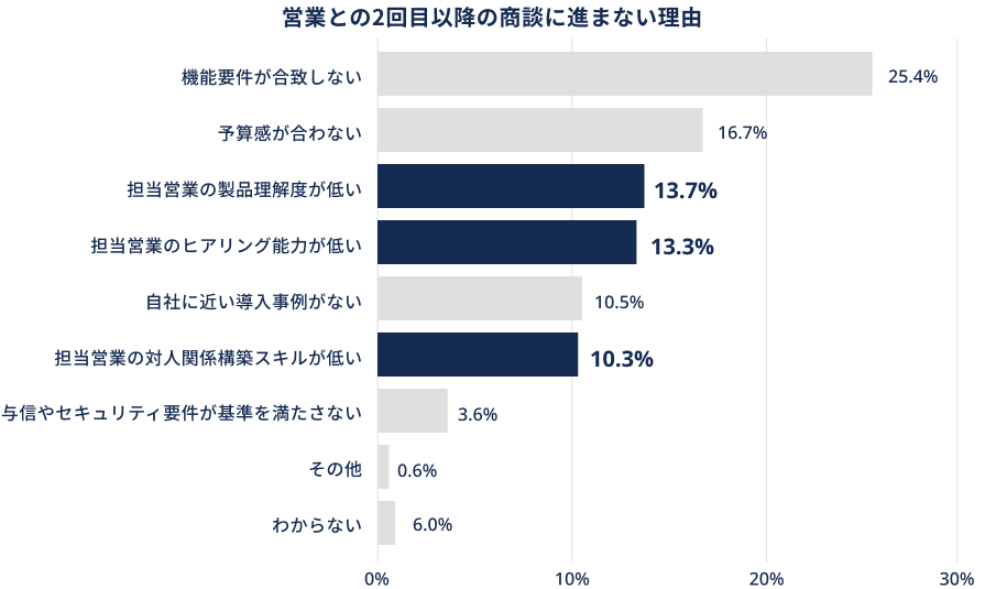 営業との2回目以降の商談に進まない理由、営業担当のスキルに依存するものが全体の37.3%