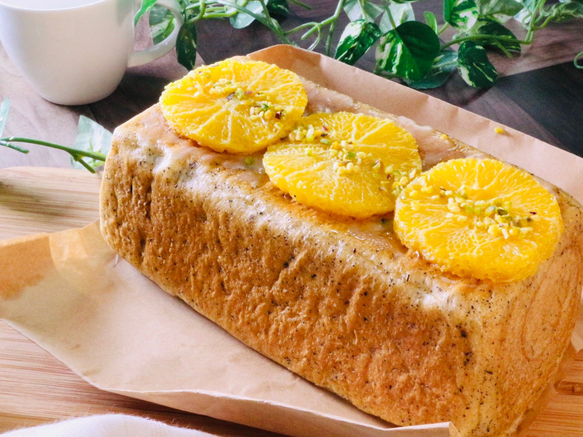 手の平に収まるちょうどいいサイズながら、見た目よりもずっしりとした重さ。パッケージを開けた瞬間に漂うオレンジの香り。パンの断面に浮かび上がる茶葉とオレンジピール、その黒とオレンジのコントラスト。そして砂糖と水を練って作ったアイシングを施された表面には、鮮やかな色のオレンジとピスタチオが目を楽しませてくれます。