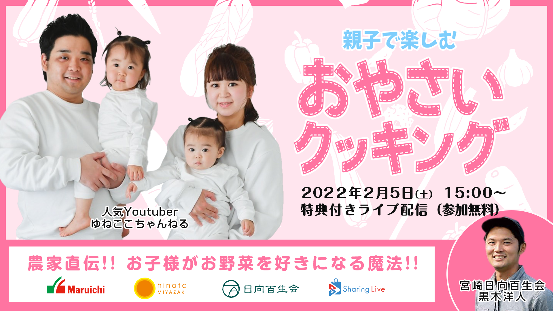 また、スタジオでは今回紹介するオーガニック野菜を使い、史上最年少・1歳と2歳の姉妹ライバーが親子クッキングに挑戦。素材そのものを楽しみながら調理する様子をライブ配信します。配信中紹介する野菜の抽選と販売も予定。日向百生会が生産するオーガニック野菜『ひなベジ』ブランドの浸透を図ります。