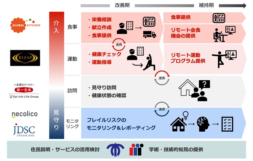 株式会社JDSC(代表取締役社長 加藤エルテス聡志、以下「JDSC」)は、千葉県市原市、東京大学大学院 情報学環・学際情報学府、第一生命保険株式会社(以下「第一生命」)、グローバルキッチン株式会社(以下「グローバルキッチン」)、RIZAP株式会社(以下「RIZAP」)、および合同会社ネコリコ(以下「ネコリコ」)とフレイル(※)予防・改善に向けた新たな事業の構築に向けて連携協定を締結したことをお知らせいたします。