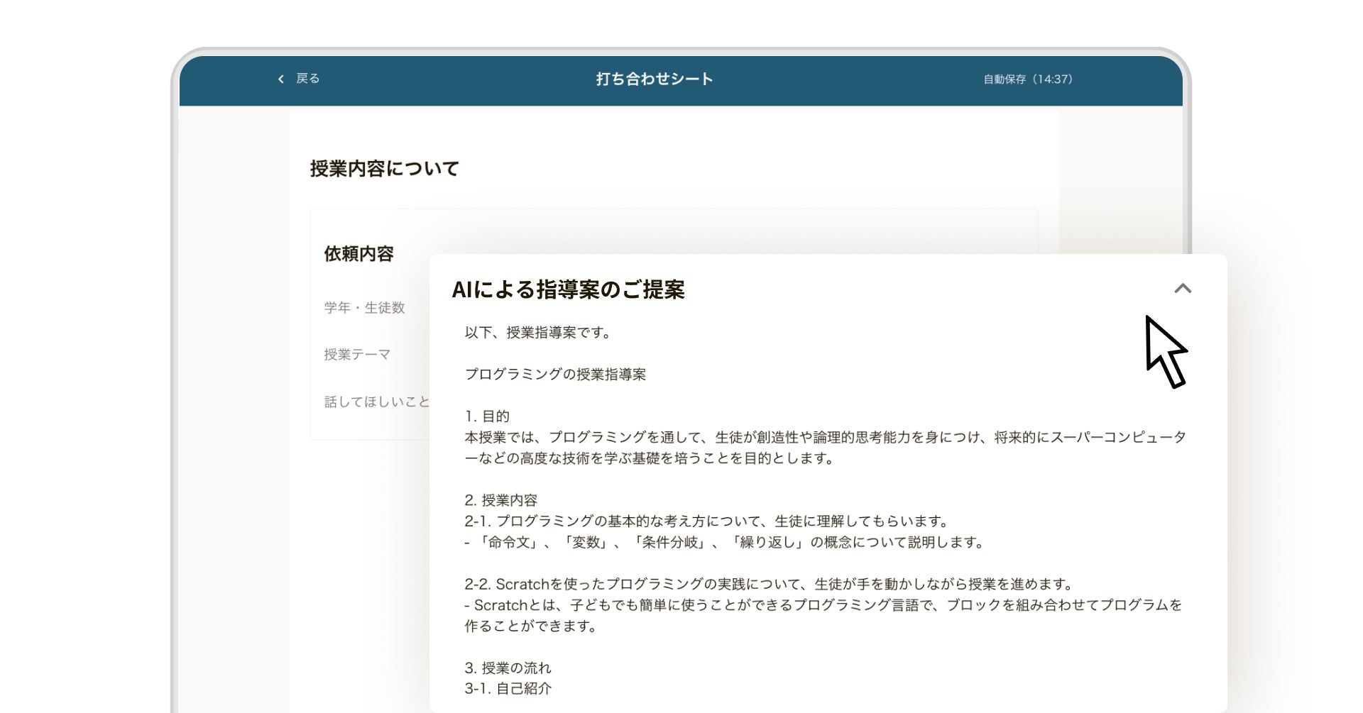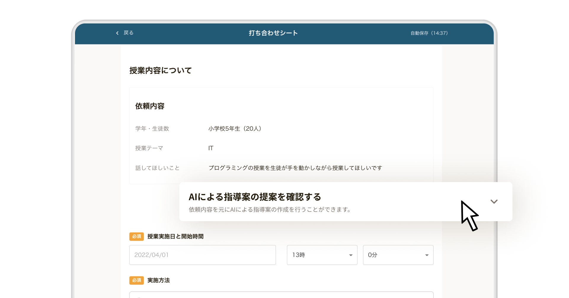 今回の新機能は、『複業先生』の授業依頼ページ内にある「授業内容の提案を見る」ボタンを押すだけで、よりChatGPTによる授業案の内容が提示されるものです。