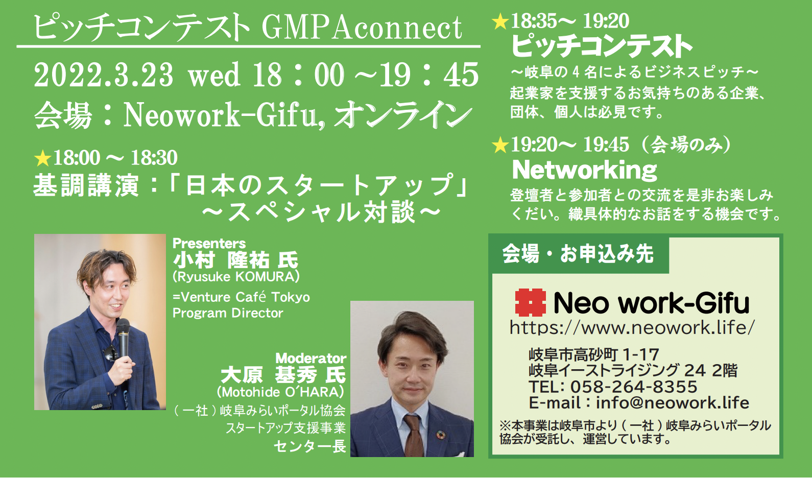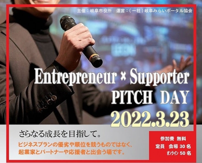 開催内容:ピッチ(=ビジネスプレゼンテーション)に特化したイベントを開催。登壇者として、岐阜にゆかりのあるこれから大きく飛躍するであろう起業家4名の登壇を実施。ピッチ後、会場では、起業家と参加者が繋がる交流会が実施されます。会場とオンラインの同時開催です。参加申し込みは、以下よりお申し込み下さい。