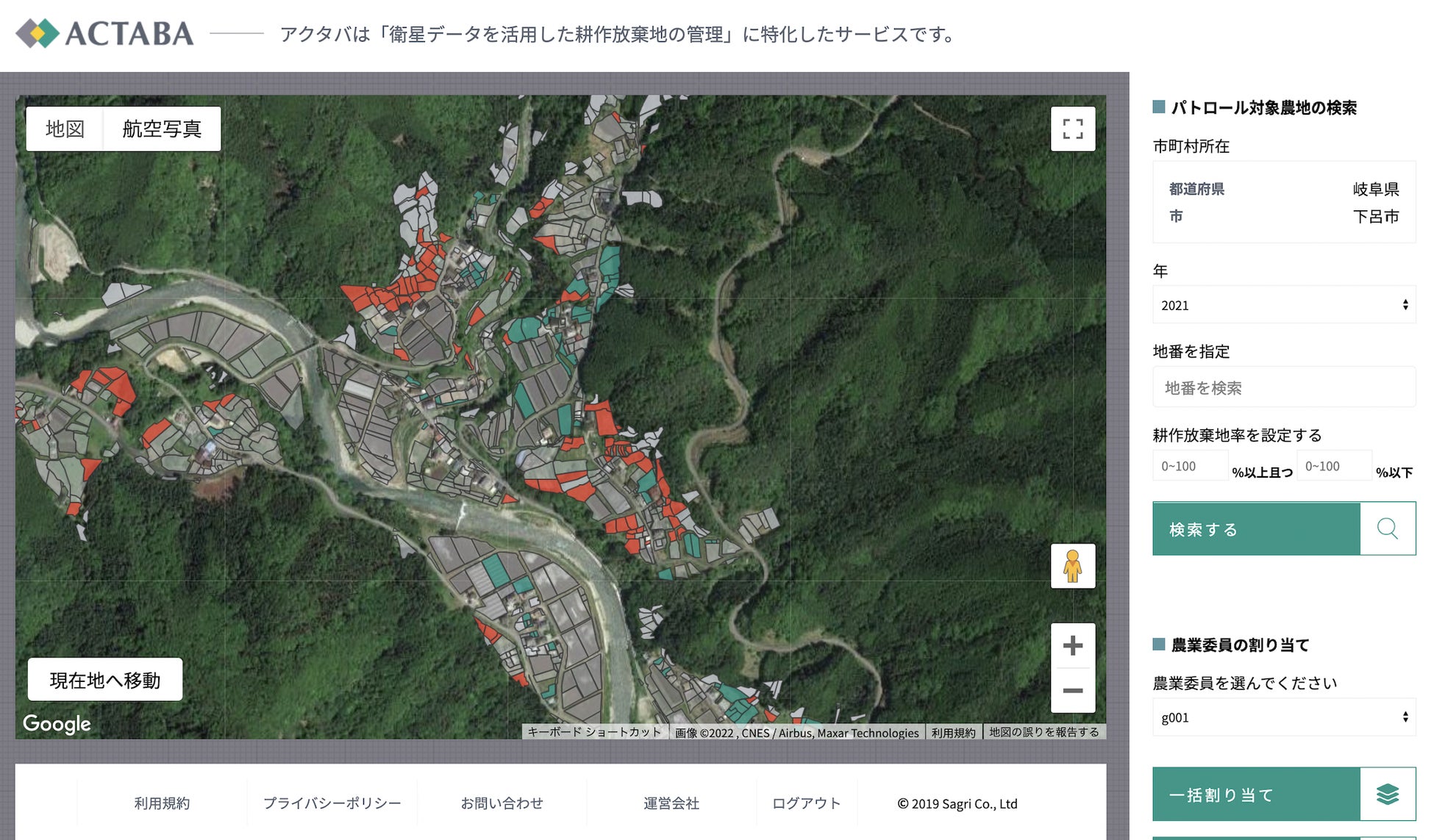 弊社は、衛星データとAIによる機械学習を掛け合わせ、耕作放棄地の検出を高精度で可能とし、農地管理をデジタル化できる耕作放棄地検出アプリACTABAの開発を行いました。現在、延べ40以上の市町村と実証を行っています。岐阜県では下呂市農業委員会に正式に導入され、全国で初めての導入事例となりました。