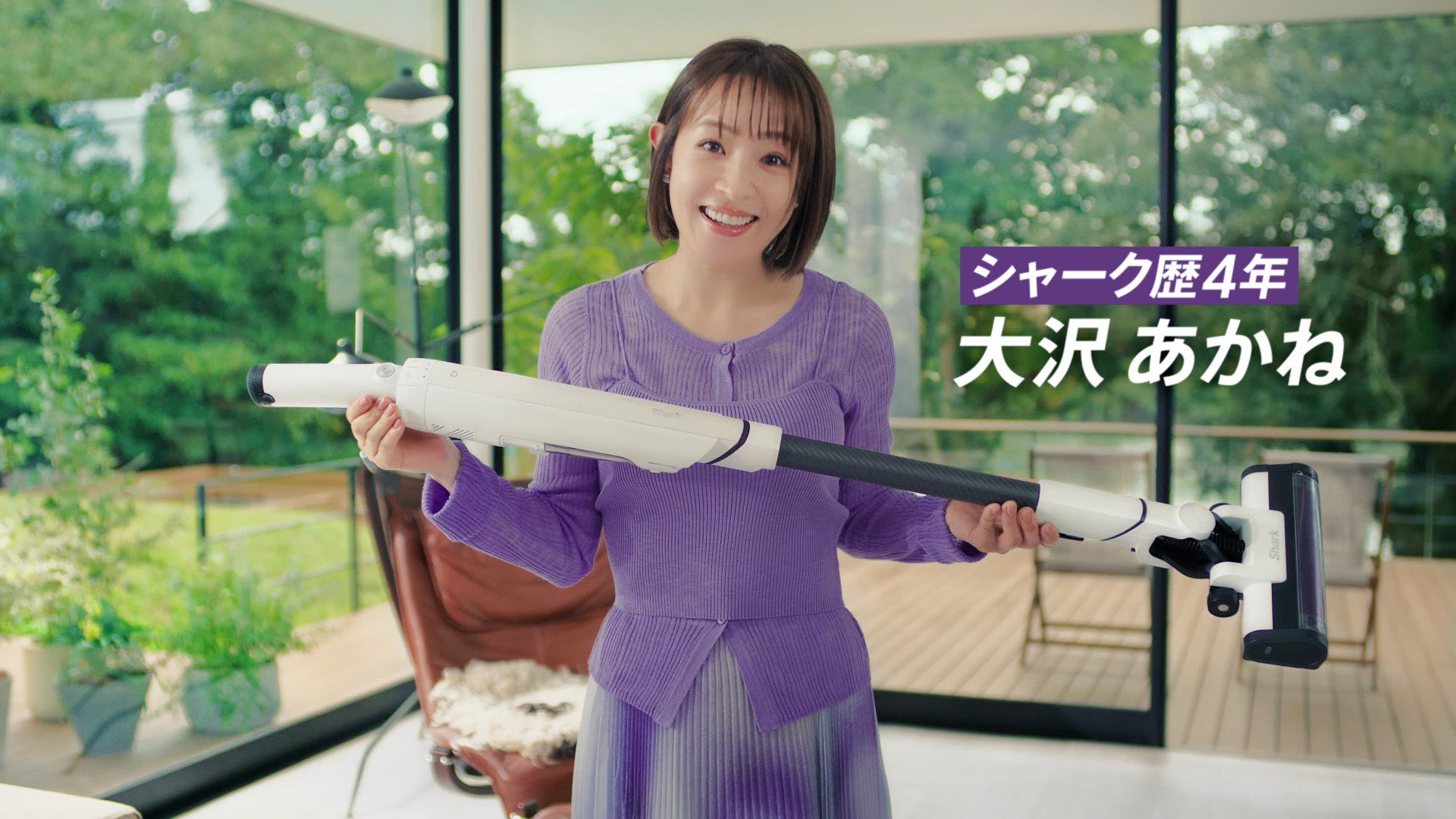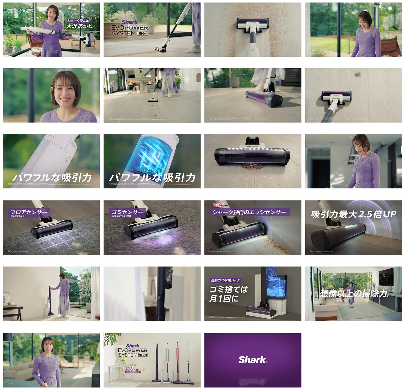SharkのEVOPOWER SYSTEMの初代モデルを4年間愛用している大沢あかねさんは、ユーザーならではの目線で「Shark EVOPOWER SYSTEM NEO Ⅱ/NEO Ⅱ+」の進化を体感。フローリングやカーペットの掃除にはシャーク独自の3つのセンサーが反応し、特に壁際や部屋の角は「エッジセンサー」のおかげで効率よく掃除ができることに驚いています。大沢あかねさんがCMの最後に語る「断然、私はシャーク」という言葉は、掃除をするたびに実感するシャークの進化に対する納得の一言です。