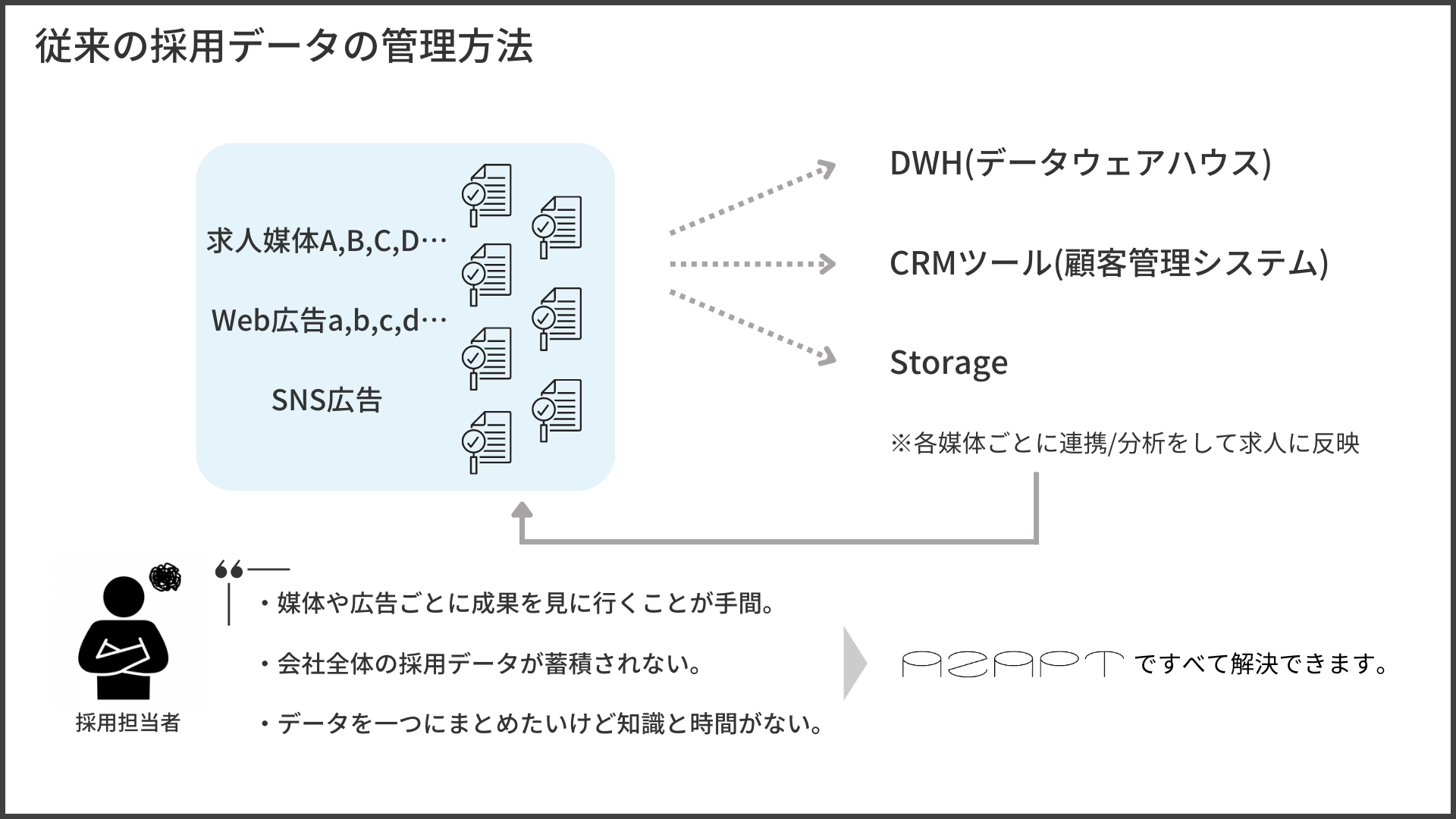 採用広告や求職者情報以外にもデータウェアハウスやCRMツール、Storageなど様々なデータが点在しております。