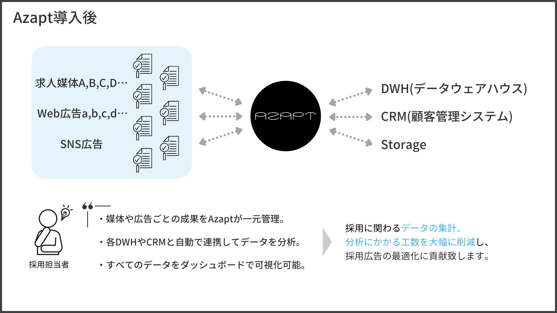 このような課題を解決するべく、データとデジタル領域に特化して採用広告運用を支援するためのサービスとして「Azapt」をリリースする運びとなりました。