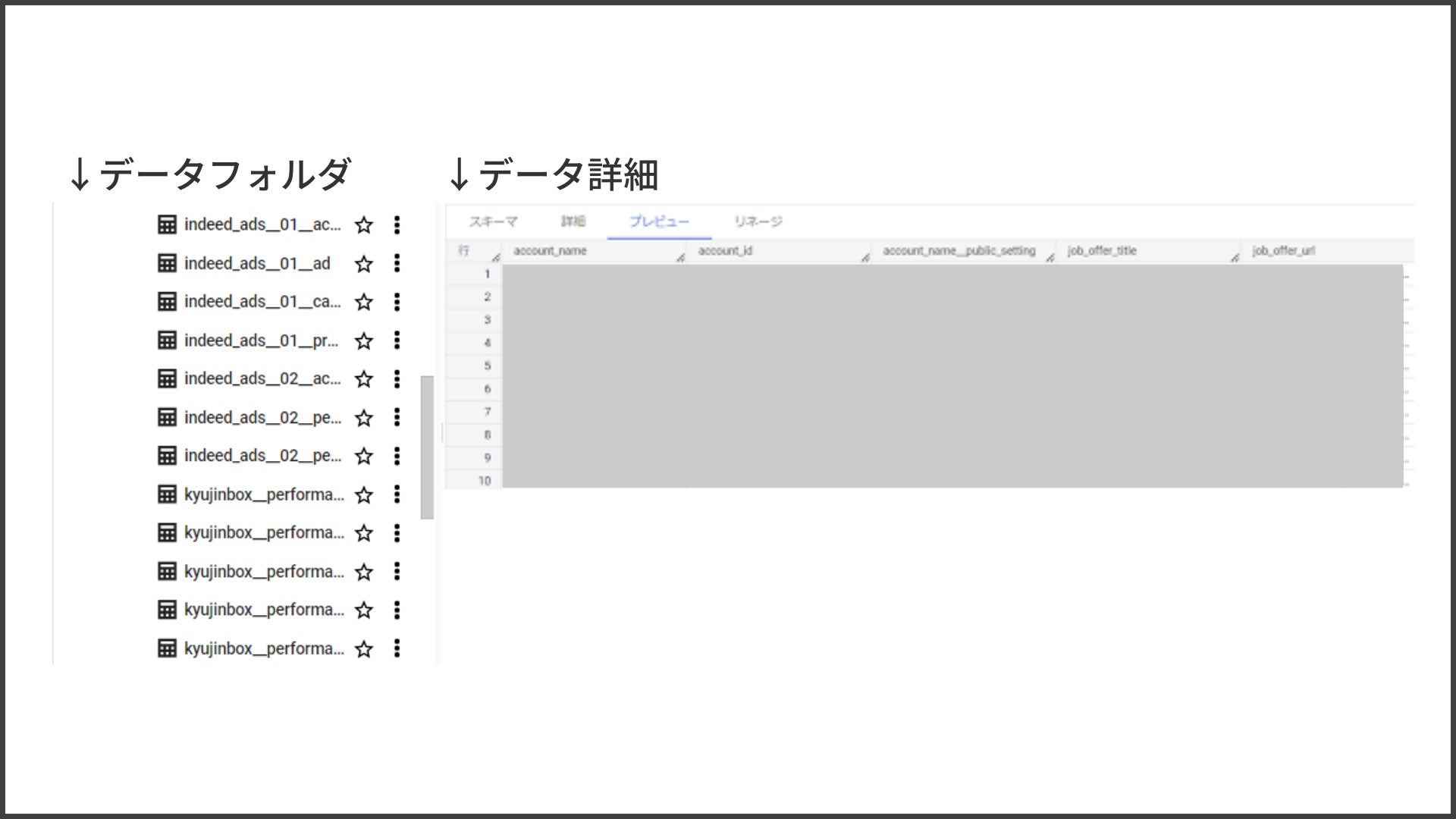 それらのデータをGoogle BigQuery、Snowflakeに生データ形式で自動的に格納し、自社の採用結果と紐付けられる採用マーケティングに用いるビッグデータの環境を構築することができます。