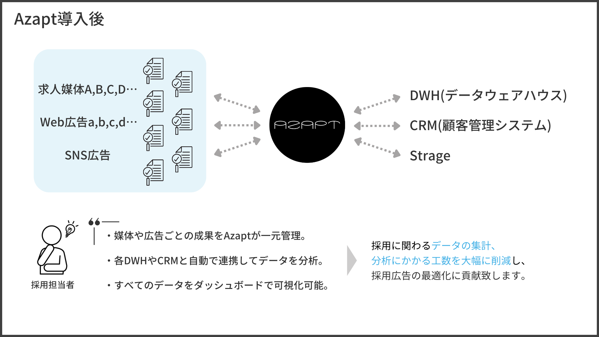 求人の媒体や広告ごとに行っていた採用コストと成果を『Azapt』にて集約、各CRMツールとも連携を図りつつ、データ可視化のサポートをいたします。