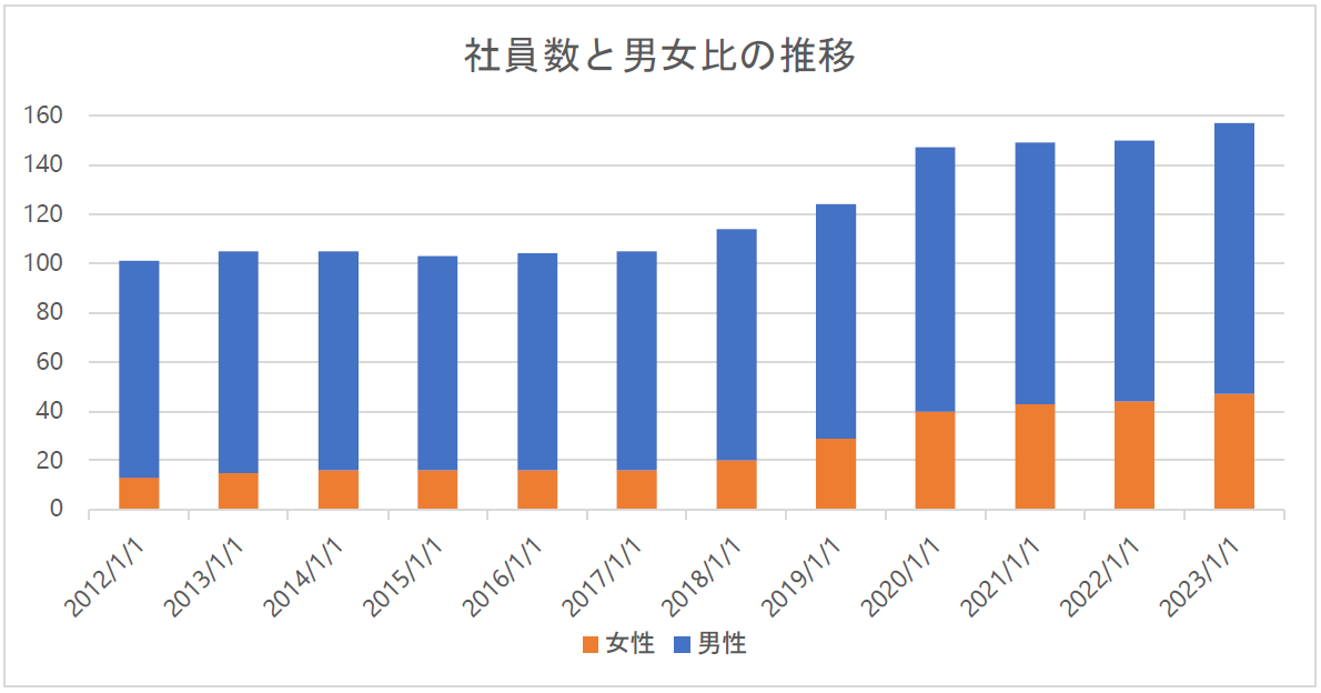 2023年1月時点 社員数:157名(男性:女性=70%:30%)