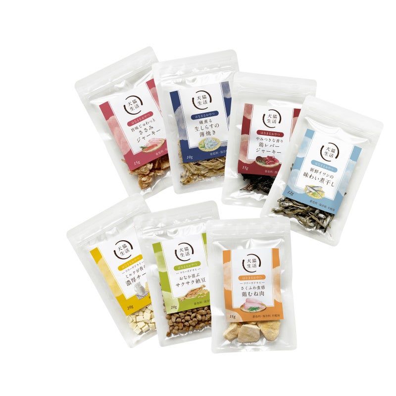 ・味:7種類展開 【フリーズドライ ミルクが香る濃厚チーズ】【フリーズドライ さくふわ食感鶏むね肉】【フリーズドライ おなか喜ぶサクサク納豆】【旨味じゅわっとささみジャーキー】【やみつきな香り鶏レバージャーキー】【新鮮イワシの味わい煮干し】【磯薫る生しらすの薄焼き】
