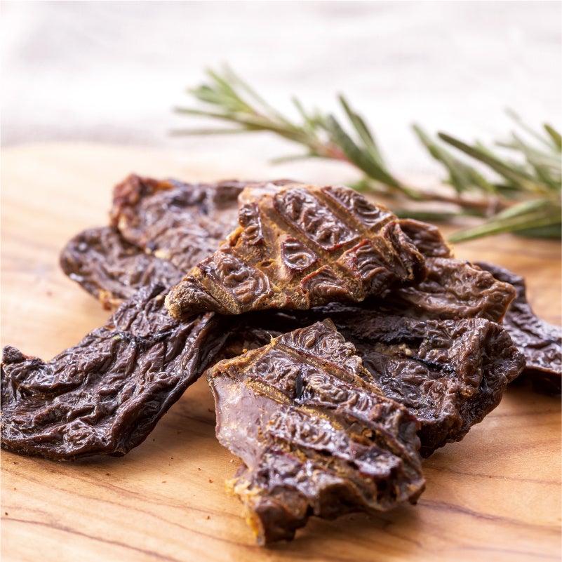 豊かな自然と水に恵まれた広島県で、ハーブ入りの特別飼料を食べて育った「ひろしまハーブ鶏」。そのささみ肉をスライスし、低温風でじっくり乾燥させて仕上げたジャーキーです。固すぎず、柔らかすぎない絶妙な歯ごたえも魅力です。